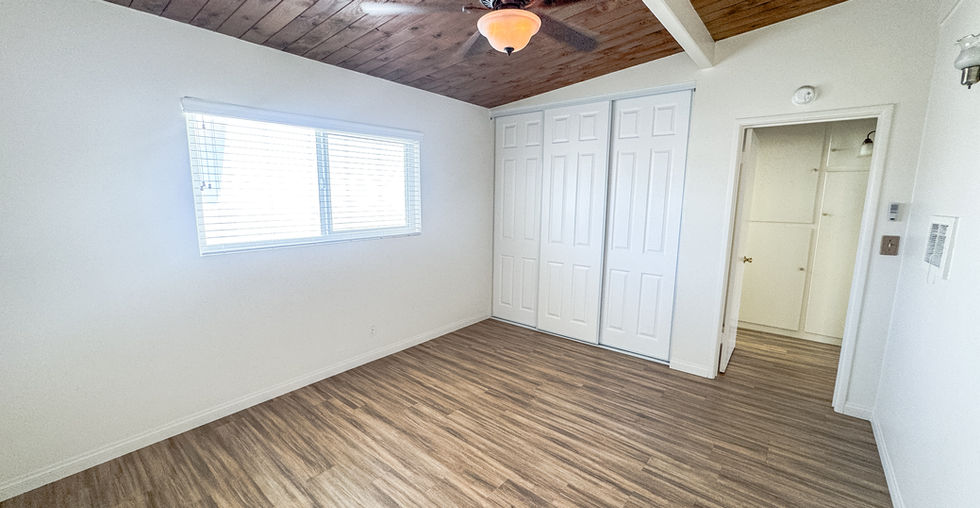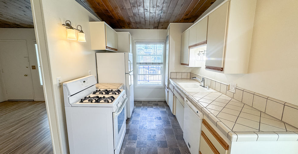 Welcome to your coastal escape! This beautifully maintained 1-bedroom, 1-bathroom upper-level apartment offers 620 sq ft of bright, open living space, plus an additional 250 sq ft private front patio—perfect for relaxing or entertaining with ocean breezes just a few buildings away. Inside, you'll find hard surface flooring throughout and stunning wood vaulted ceilings that create a warm, spacious feel. The open-concept layout includes a large living area, a well-appointed kitchen with dining area, and plenty of natural light.